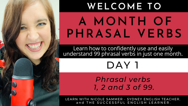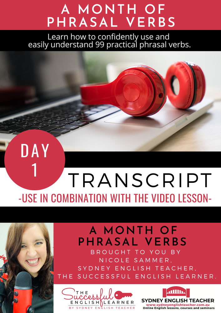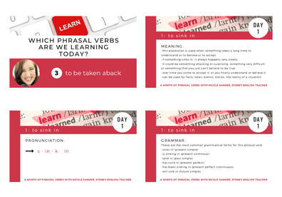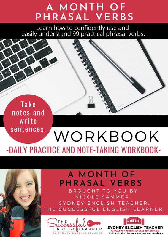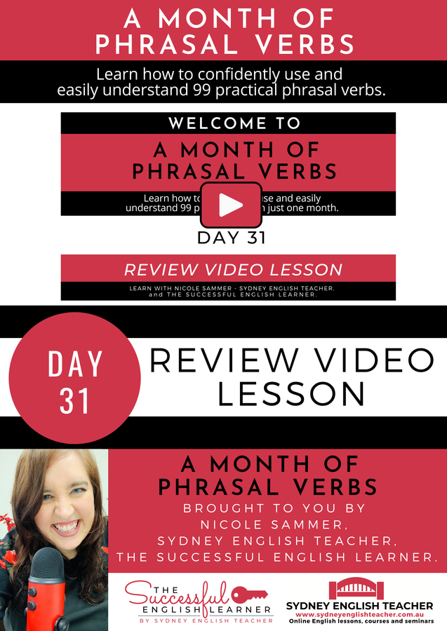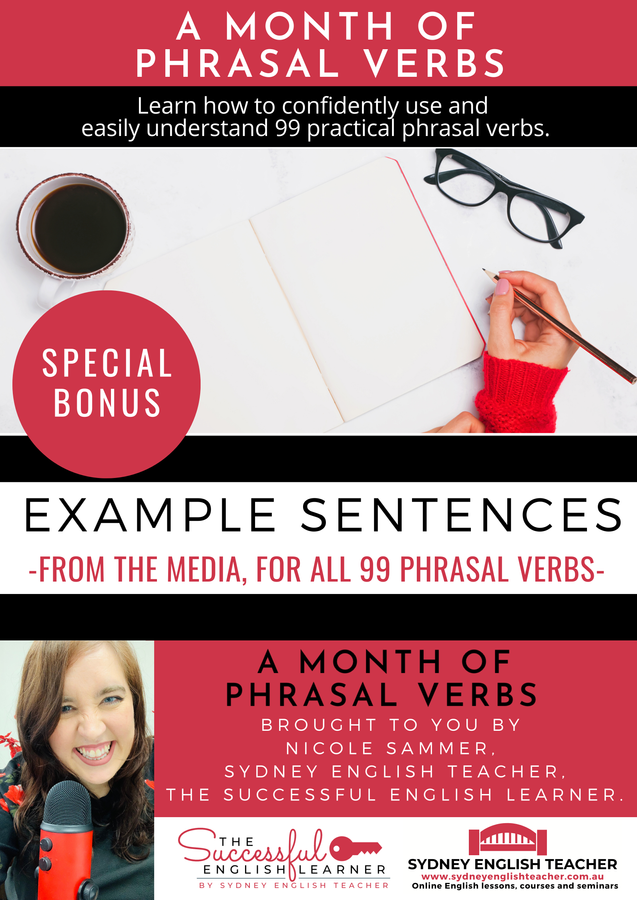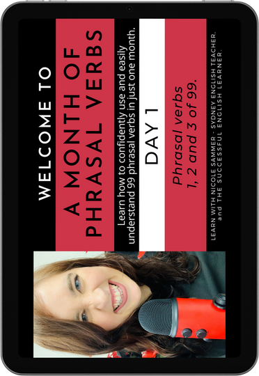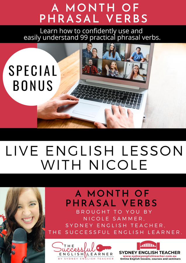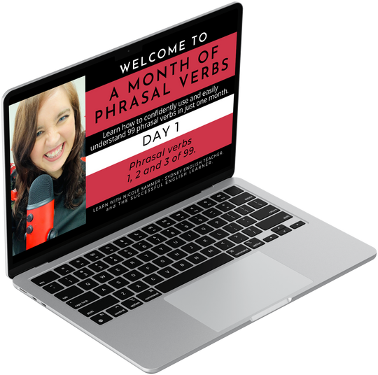 Hi, I’m Nicole Sammer, the course creator and teacher behind Sydney English Teacher and The Successful English Learner. Thank you for your interest in A Month of Phrasal Verbs. My special teaching method combined with the targeted practice exercises and repetitive video lessons provided in this course will make remembering phrasal verbs almost automatic, and understanding and using them easier than you ever thought. I am committed to helping you get the best results from this course and am thankful for the opportunity to guide you towards reaching your English language goals. I hope to see you on the inside!